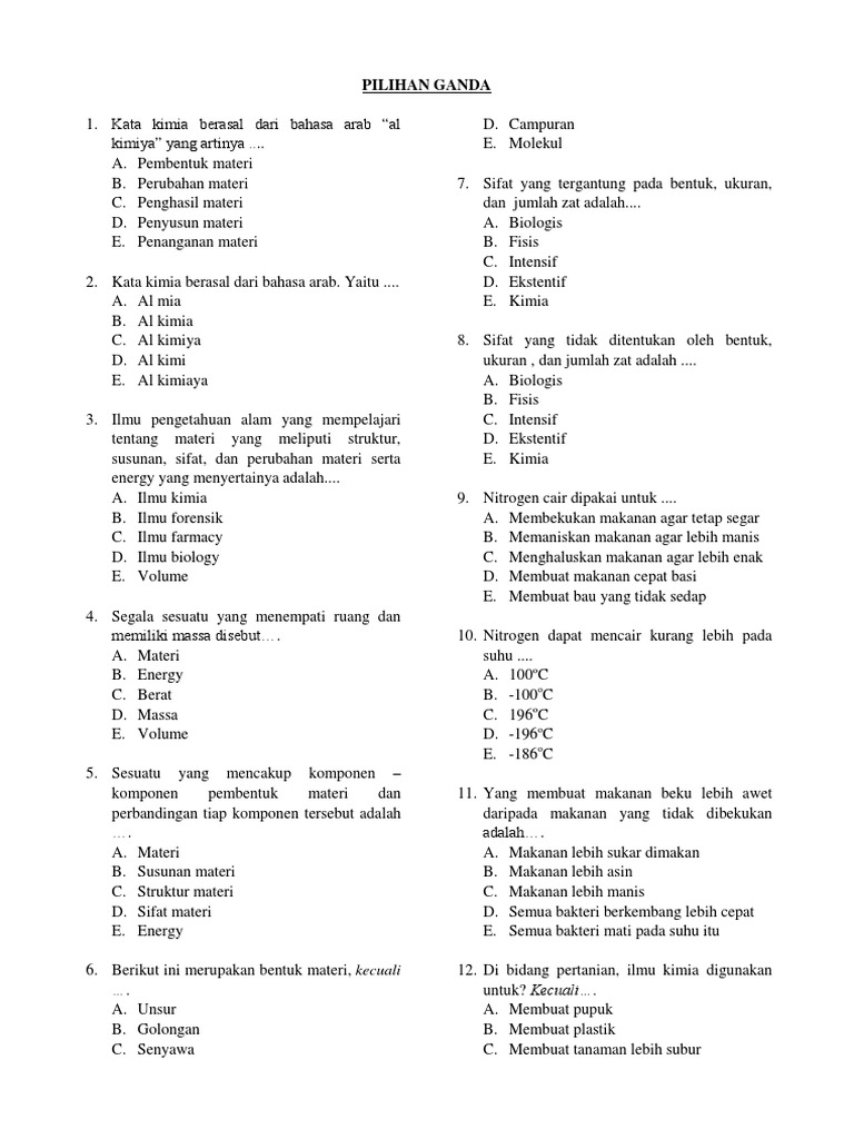 Uji Kompetensi BAB I (Hakikat Ilmu Kimia) Pilihan Ganda + Kunci …