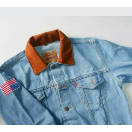 Jaket jeans dilan kerah yg di lapisi kain hedlong tebal warna gold dan ada bendera di bagian tangaan | Shopee Indonesia