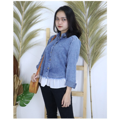 Jual jaket jeans Claretta Ruffle Denim Shirt Kemeja Jeans Combi kain -56311 - Kab. Bekasi - Fx Boutique Shop | Tokopedia