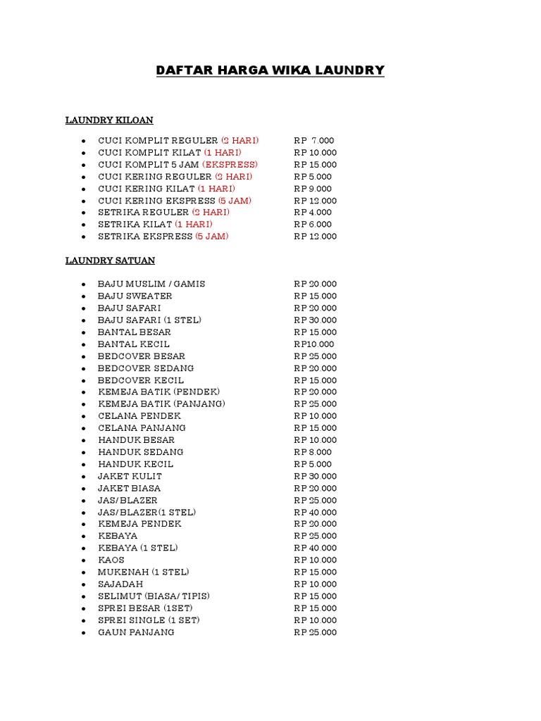 Daftar Harga Wika Laundry