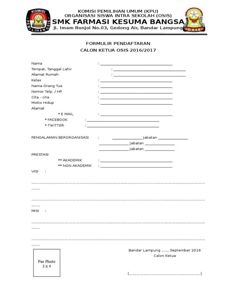 Contoh Formulir Registrasi Calon Ketua Osis | Selalu Belajar