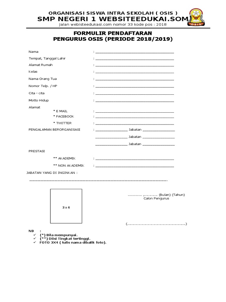 Contoh Formulir Pendaftaran Calon Pengurus Osis | Smp Pilpay …