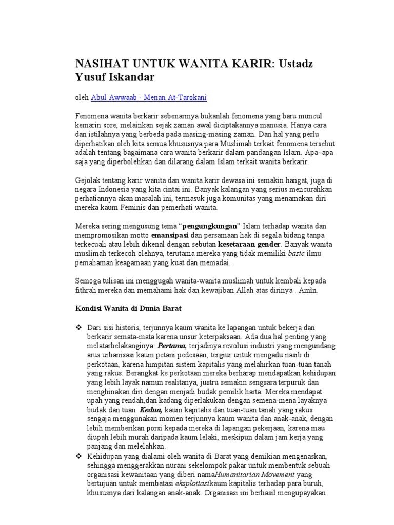 Nasihat Untuk Wanita Karir: Ustadz Yusuf Iskandar: Abul Awwaab - Menan At-Tarokani