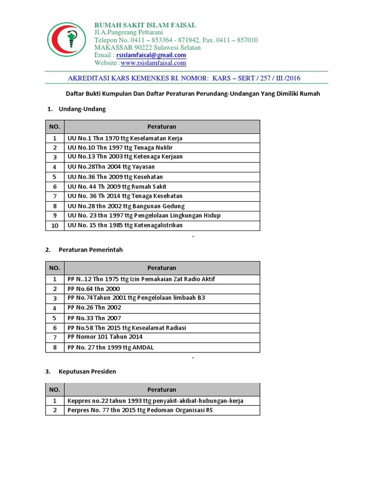 1.1 Daftar Bukti Kumpulan Dan Daftar Peraturan Perundang-undangan Yang Dimiliki Rumah Sakit