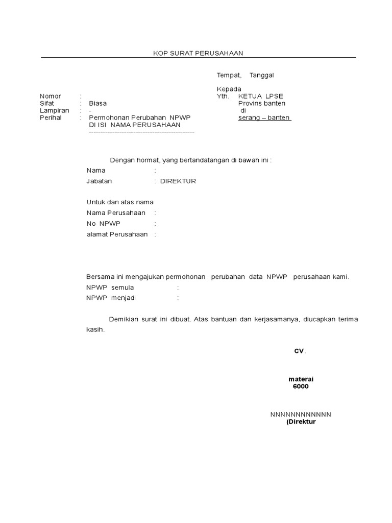 Template Surat Permohonan Perubahan data NPWP Penyedia