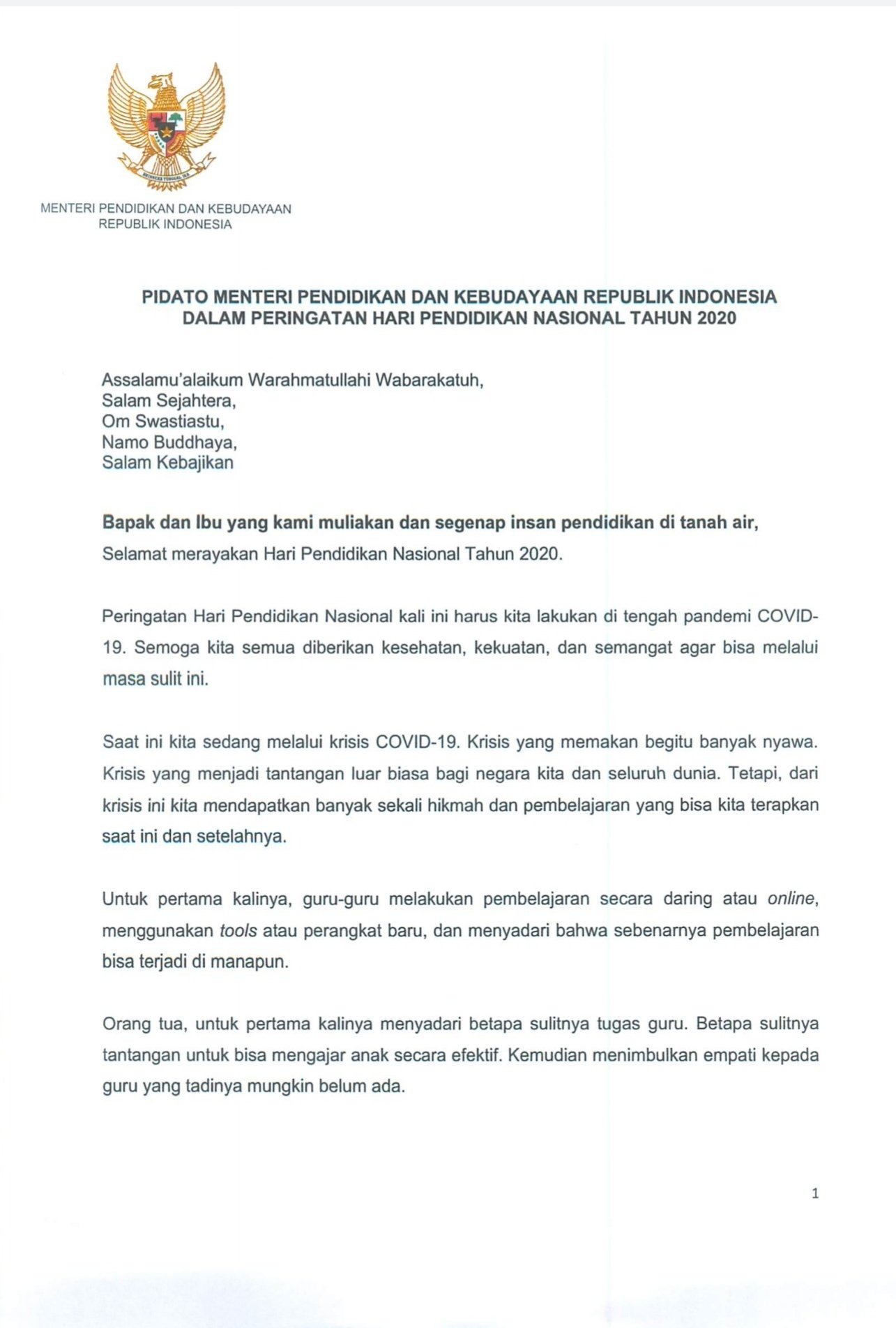 MerdekaBelajar on Twitter: “Berikut pidato Menteri Pendidikan dan Kebudayaan Nadiem Anwar Makarim pada Peringatan Hari Pendidikan Nasional Tahun 2020. Pidato dapat diunduh di laman https://t.co/kgYrQ2dLyW. #Hardiknas2020 #BelajardariCovid19… https://t …