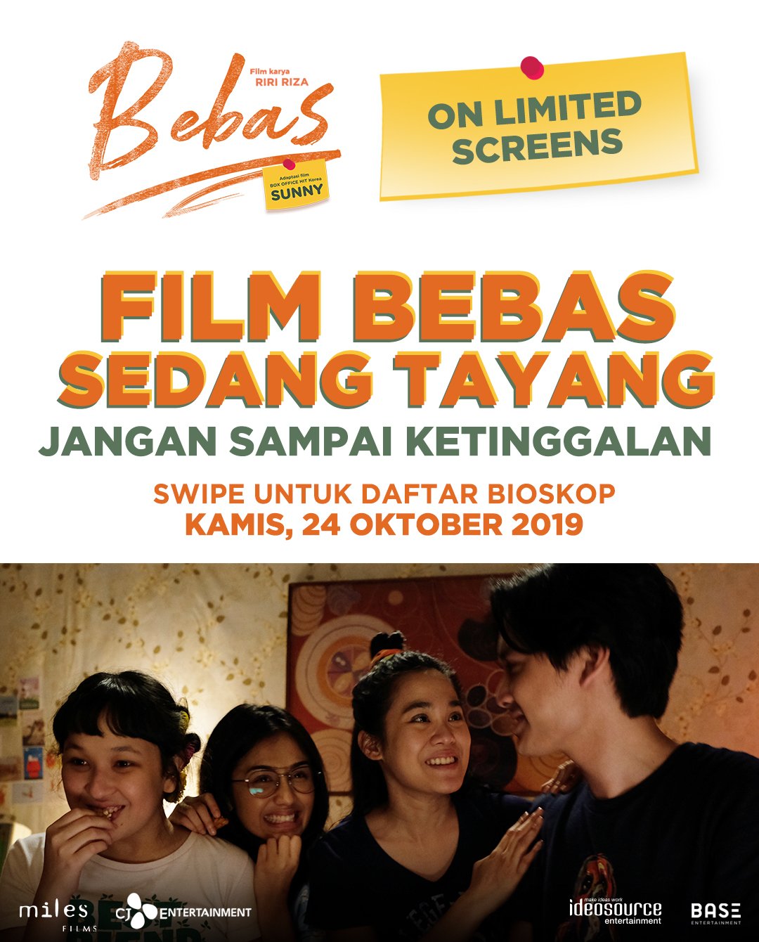Miles Films : “Jangan sampai ketinggalan nonton #FilmBEBAS. Segera ke bioskop-bioskop di kotamu untuk ikut #GerakanNontonFilmBEBAS. Film BEBAS dari Sutradara Riri Riza dan Produser Mira Lesmana SEDANG TAYANG DI BIOSKOP #MilesFilms #