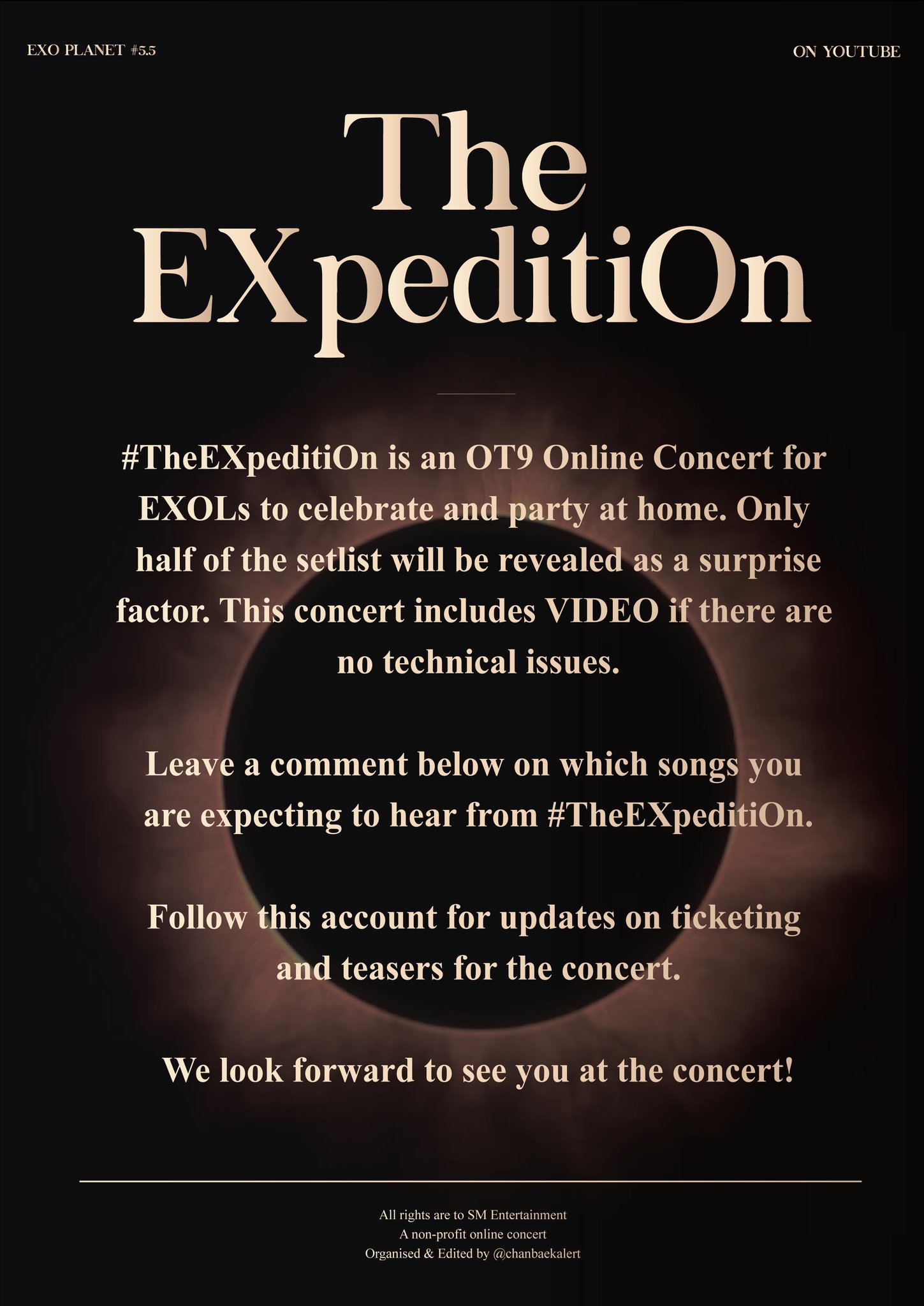 mai SGGO on Twitter: “EXO PLANET #5.5 - The EXpeditiOn ONLINE CONCERT(with video) Date: DAY 1: 13.06.20, Saturday 8PM DAY 2: 14.06.20, Sunday 8PM Location: E-Arena (YT) Ticket Open: 02.05.2020, Sat,