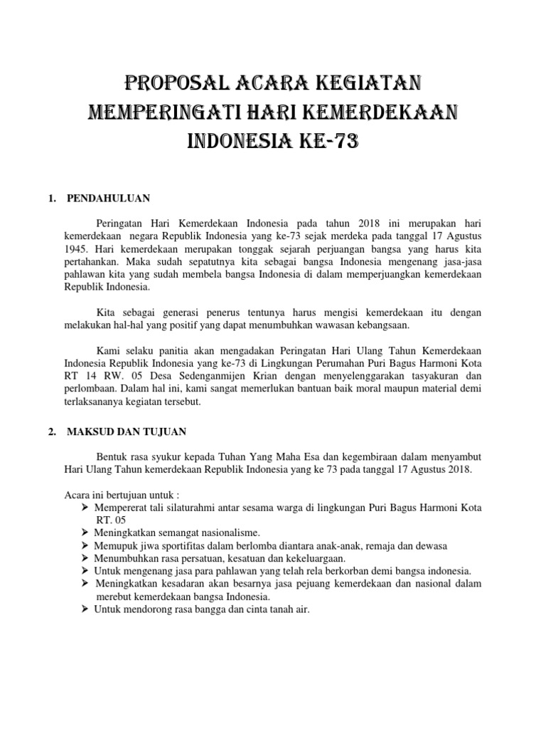 DOC) PROPOSAL ACARA KEGIATAN MEMPERINGATI HARI KEMERDEKAAN INDONESIA KE-73 | julham dani - Academia.edu