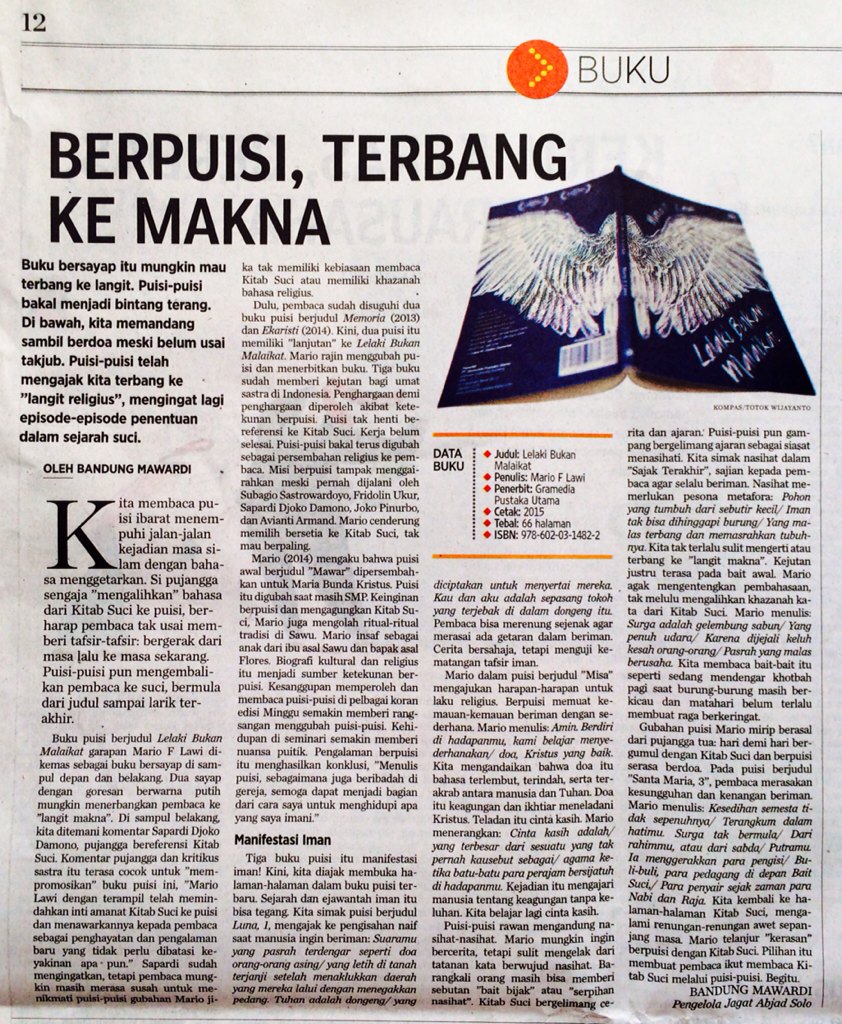sastra gpu on Twitter: “Resensi Lelaki Bukan Malaikat @mario_lawi di Kompas Minggu hr ini. Resensi buku puisi @Gramedia yg pertama di 2016 https://t.co/X7BHpWZ9XA”