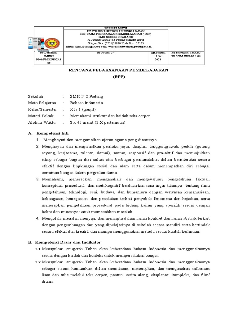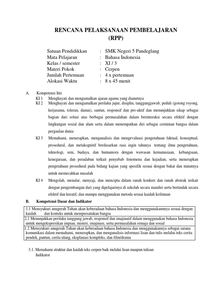 DOC) RPP BAHASA INDONESIA XI KURIKULUM 2013 CERPEN P1 | Dwi …