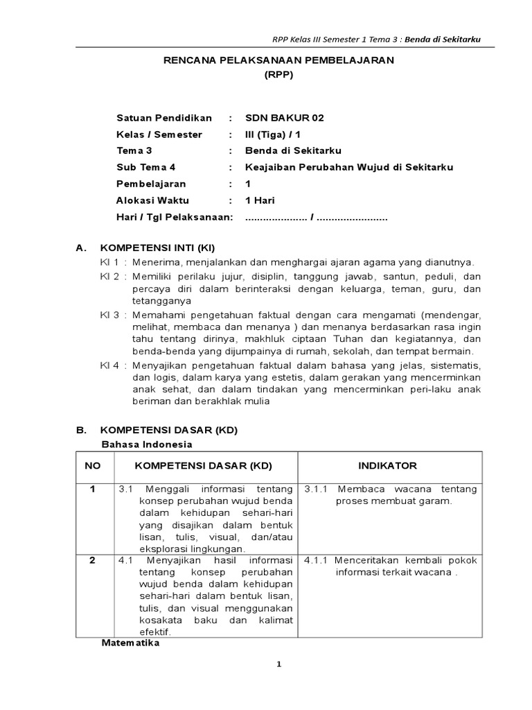 RPP KLS 3 TEMA 3 ST 3 Rev 2018.doc - RENCANA PELAKSANAAN PEMBELAJARAN(RPP Satuan Pendidikan SDN WAILITI Kelas Semester III(Tiga 1 Tema 3 Benda di | Course Hero