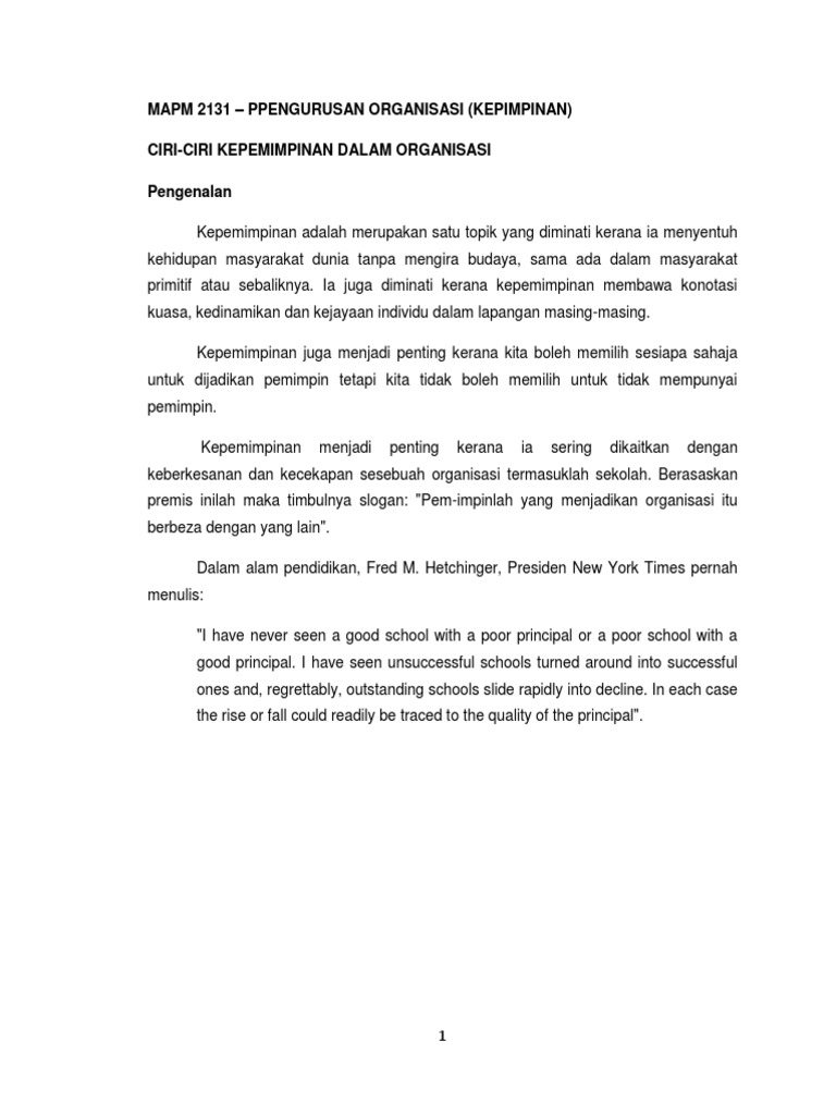 MAPM 2131 – Ppengurusan Organisasi (Kepimpinan) Ciri-Ciri Kepemimpinan Dalam Organisasi Pengenalan