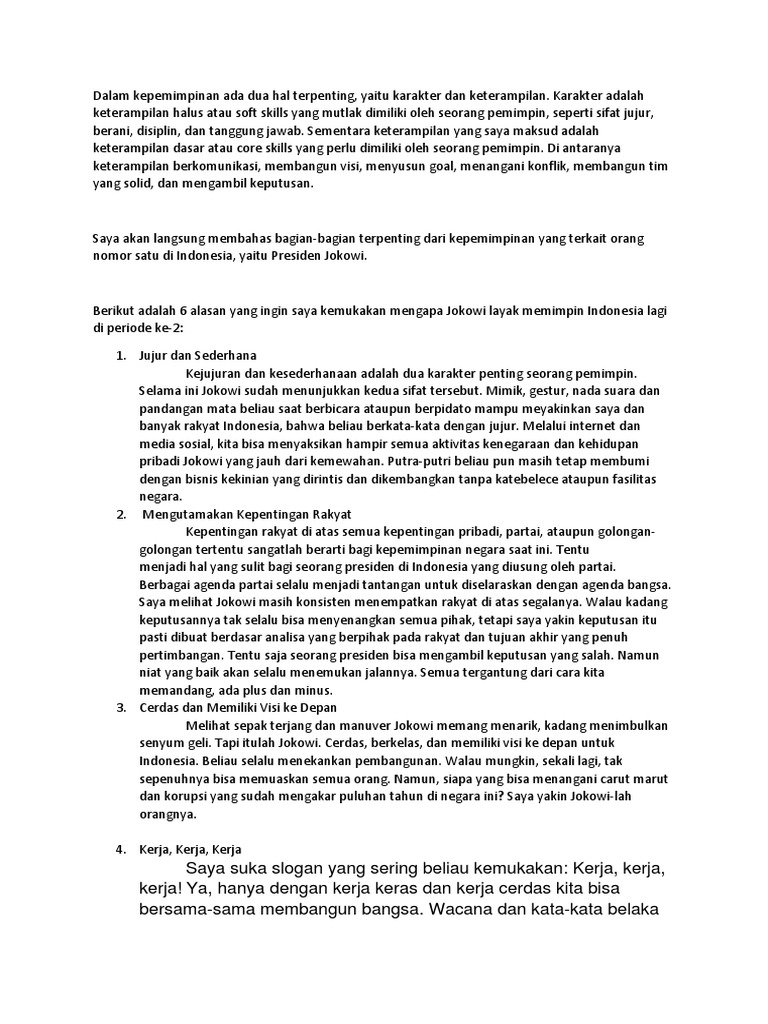 Saya suka slogan yang sering beliau kemukakan: Kerja, kerja, kerja! Ya, hanya dengan kerja keras dan kerja cerdas kita bisa bersama-sama membangun bangsa. Wacana dan kata-kata belaka