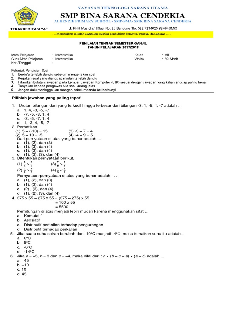 Contoh Soal: Soal Matematika Mts Kelas 7 Semester 1