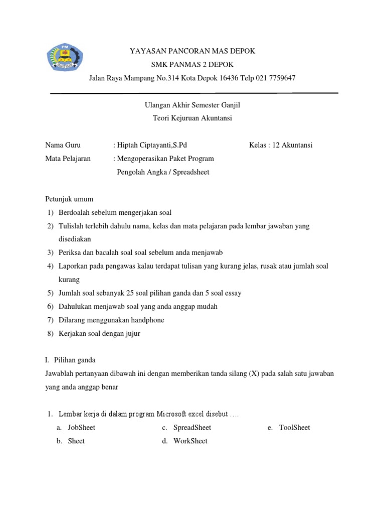 Soal Essay Spreadsheet Kelas 10 Semester 2