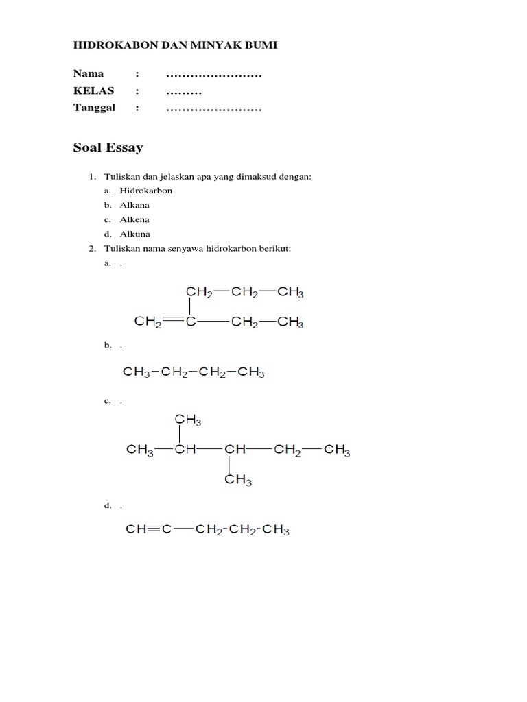 Soal Essay: Hidrokabon Dan Minyak Bumi …………………… Kelas: ……… Tanggal: ……………………