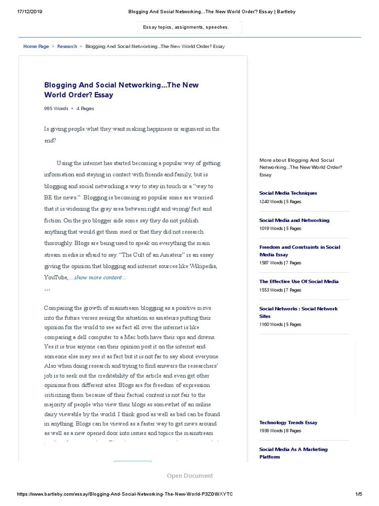Blogging And Social Networking…The New World Order_ Essay _ Bartleby.pdf | Digital & Social Media | Social Media
