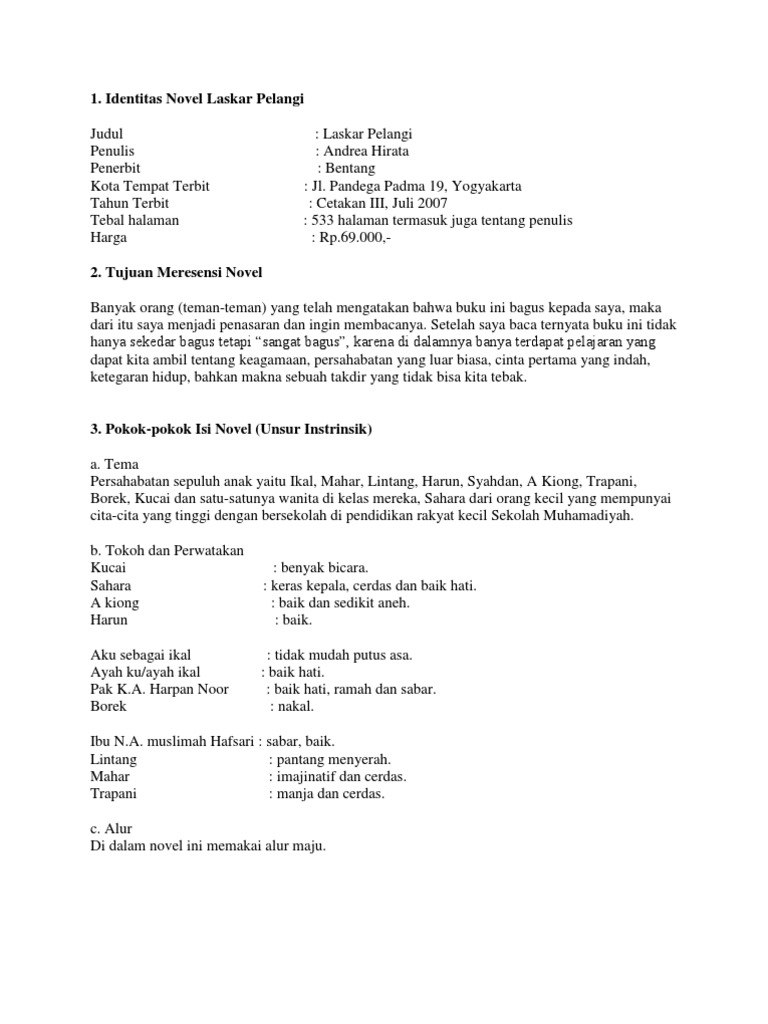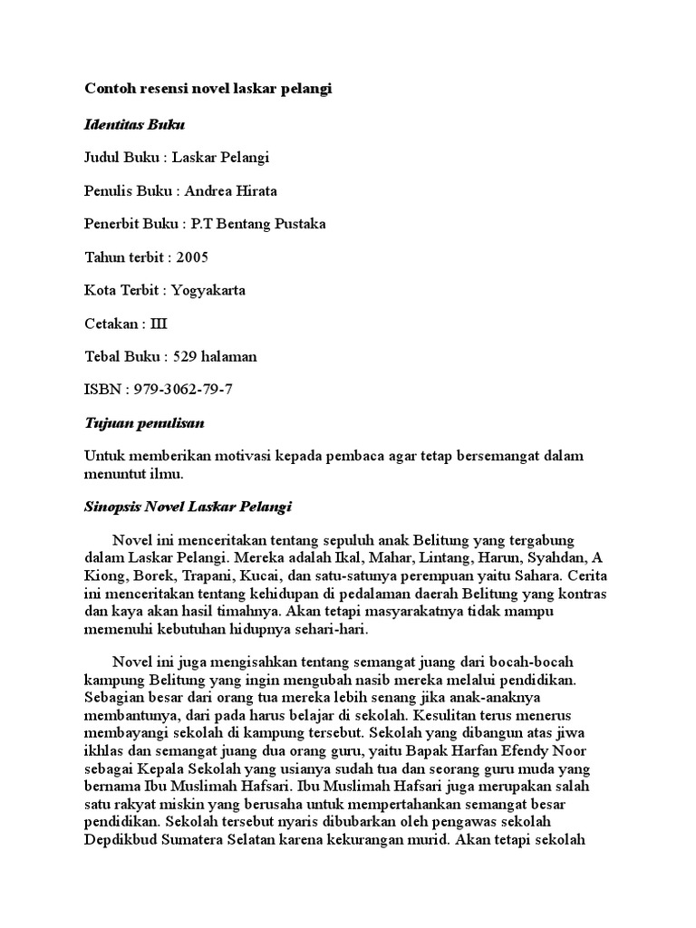 DOC) Contoh Resensi Novel Laskar Pelangi Sinopsis Novel Laskar Pelangi Novel ini menceritakan tentang sepuluh anak Belitung yang tergabung dalam Laskar | Annissa Ari Mukti - Academia.edu