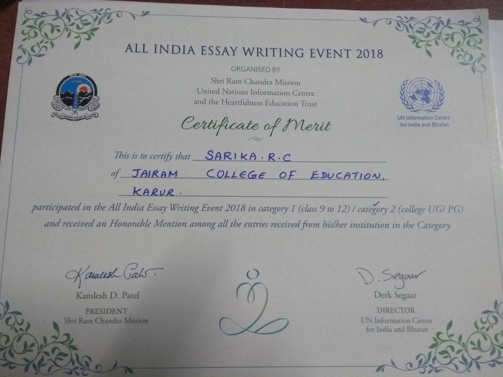 Today I got the certificate In All India Level Essay Writing competition. 22.2.2019