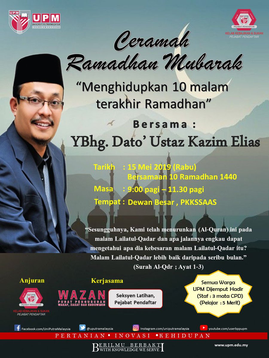 UniPutraMalaysia on Twitter: “Semua warga UPM dijemput hadir mengikuti Ceramah Ramadhan Mubarak “Menghidupkan 10 malam terakhir Ramadhan” Bersama YBhg. Dato' Ustaz Kazim Elias pada 15 Mei 2019 (Rabu) bermula jam 9:00 pagi –