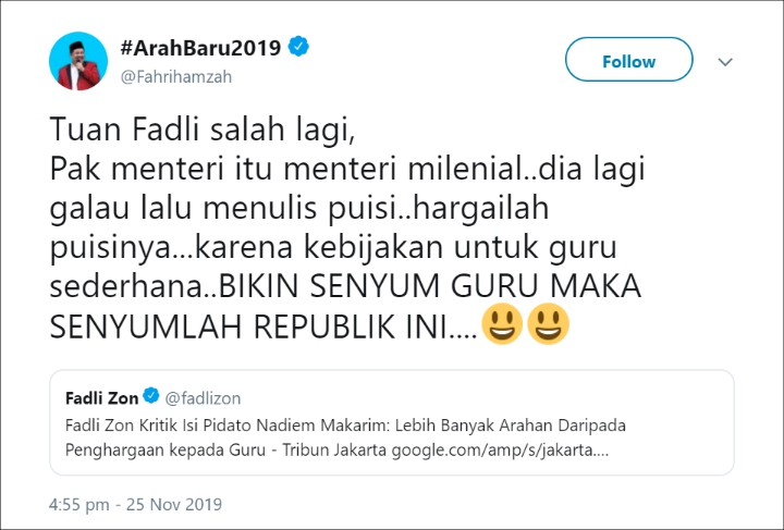 Isi Pidato Nadiem Dikritik Fadli Zon, Fahri Hamzah: Hargailah Puisi Menteri Milenial