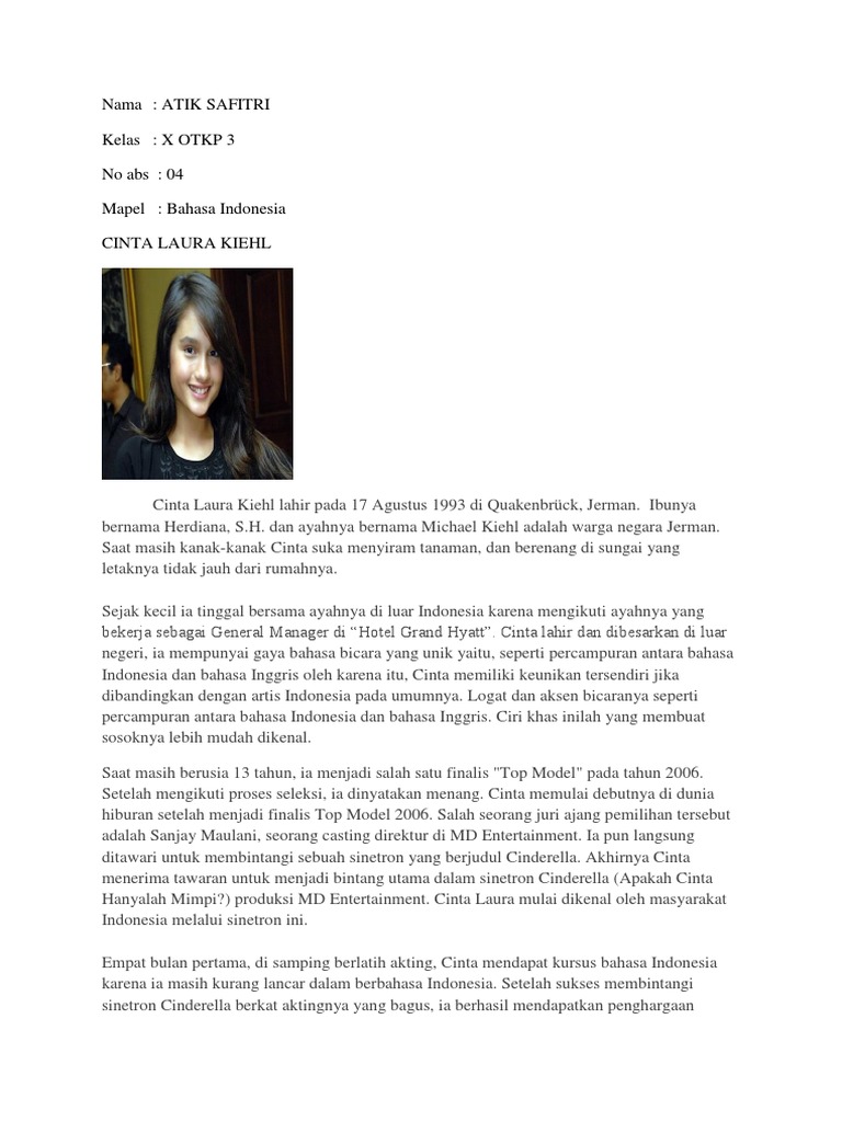 Nama: Atik Safitri Kelas: X OTKP 3 No abs: 04 Mapel: Bahasa Indonesia Cinta Laura Kiehl