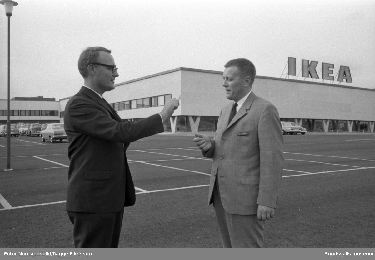 Ingvar Kamprad överlämnar nyckeln till platschef Kjell Nilsson inför öppnandet av Ikea i Birsta, landets tredje