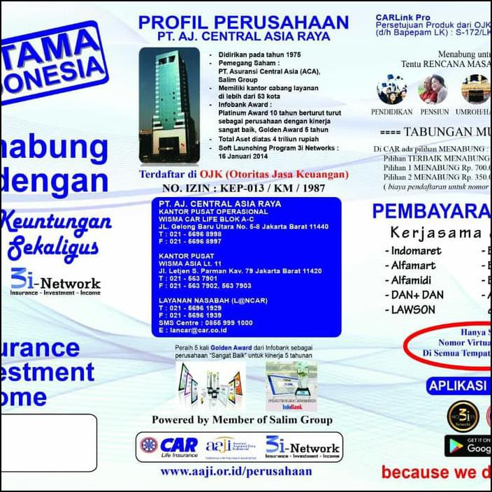 DOWNLOAD - UNIT LINK CAR | TABUNGAN 3I-NETWORKS PT. AJ CENTRAL ASIA RAYA MEMBER OF SALIM GROUP OJK | TABUNGAN INVESTASI TERBAIK | TABUNGAN CAR 3I- NETWORKS | VIRTUAL ACCOUNTI | 3I-NETWORKS | REKSADANA | SALIM GROUP