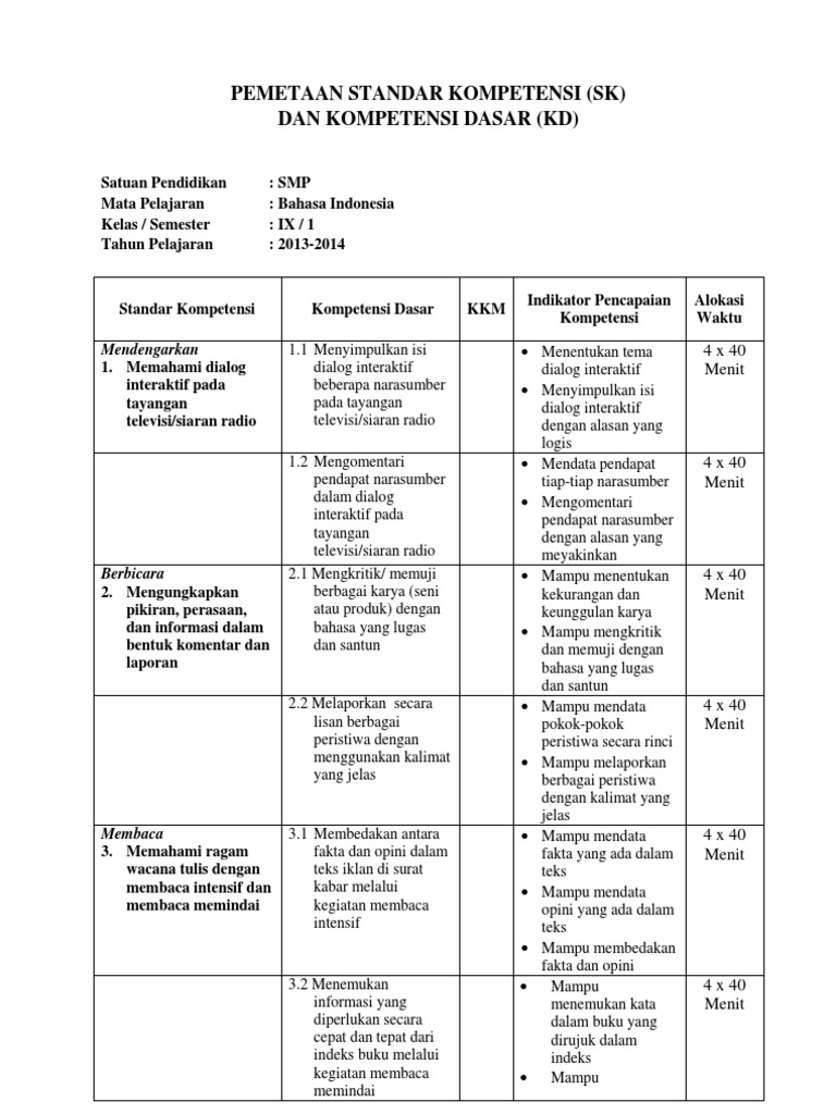 Pemetaan Standar Kompetensi dan Kompetensi Dasar Bahasa Indonesia SMP Kelas IX Semester 1