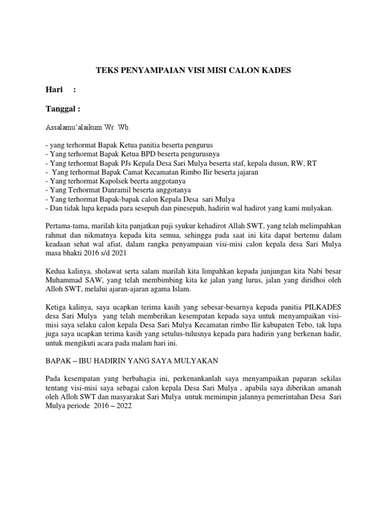 Contoh Naskah Pidato Visi Misi Bakal Calon Kepala Desa - Cute766