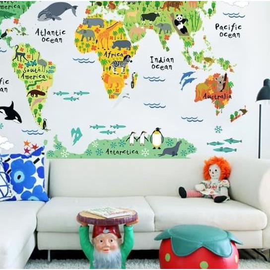SET STIKER DEKORASI DINDING MOTIF PETA DUNIA DENGAN FLORA DAN …