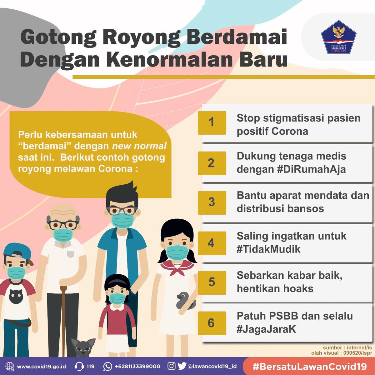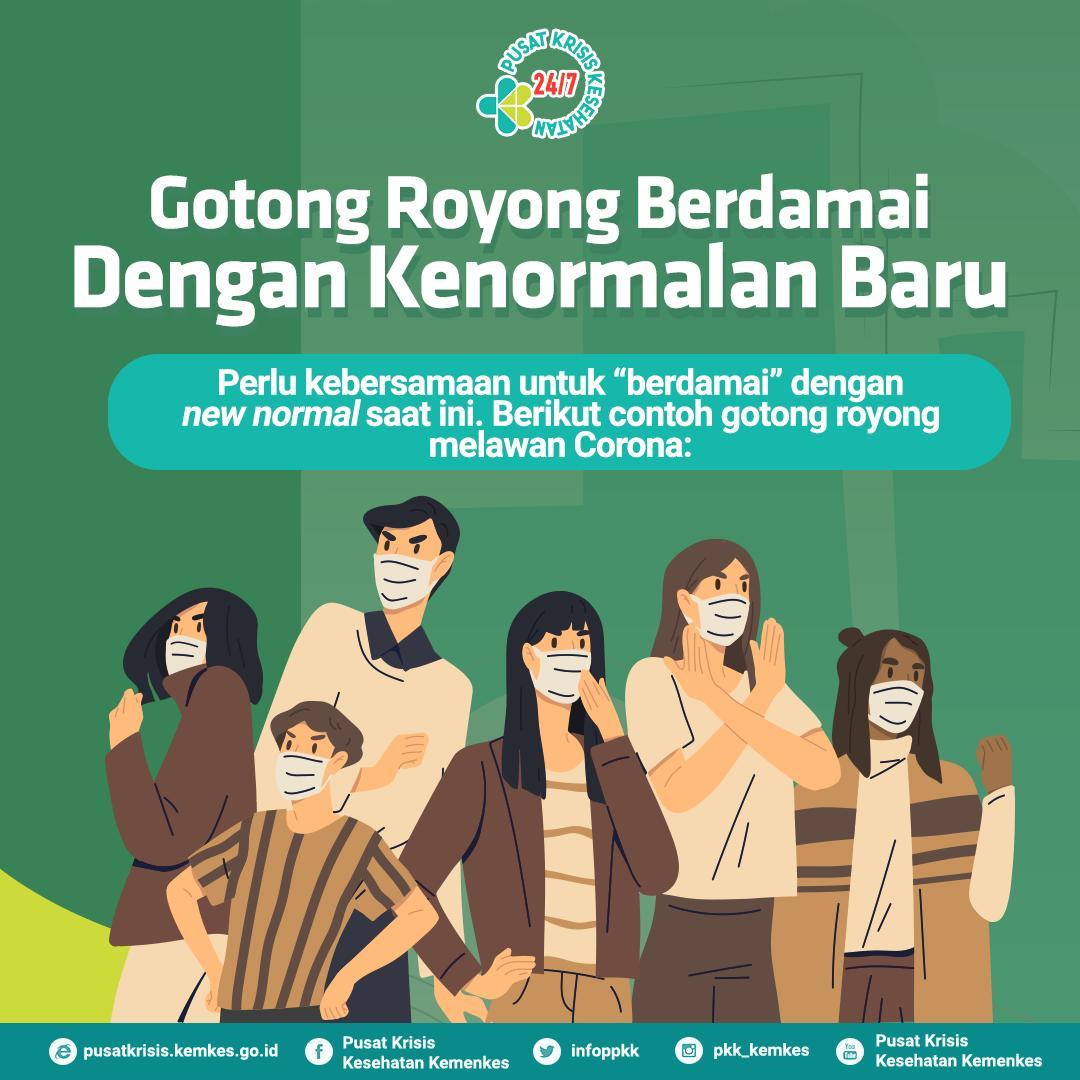 Pusat Krisis Kesehatan Kemenkes RI : “Salam sehat #sobatkriskes, menjelang kenormalan baru yuk kita saling menjaga kebersamaan dalam melawan penyebaran Covid-19 dengan saling bergotong royong dalam hal berikut. #gotongroyonglawancorona …