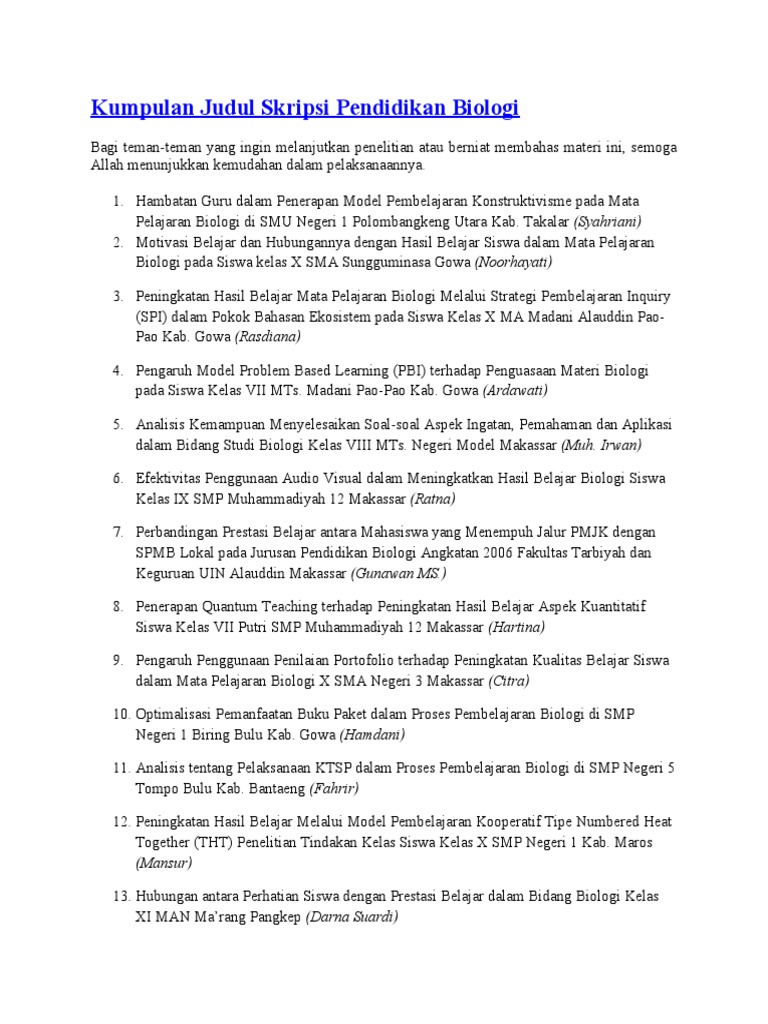 Judul Skripsi Pendidikan Biologi Murni - Ide Judul Skripsi Universitas