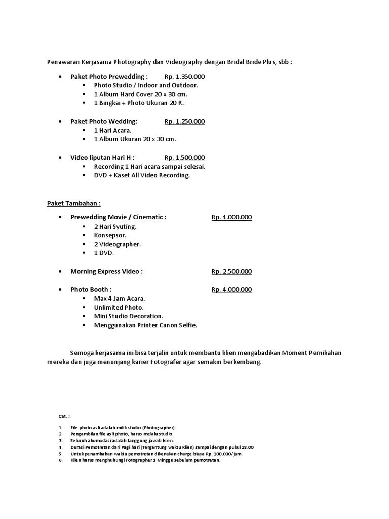 Penawaran Kerjasama Photography Dan Videography Dengan Bridal Bride Plus