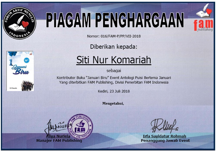 Piagam Kontributor Buku Antologi Puisi “Januari Biru”