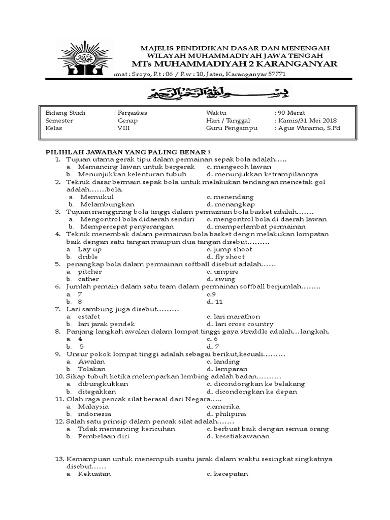 Lengkap - 45+ Contoh Soal UTS Penjaskes Kelas 9 SMP/MTs Semester …