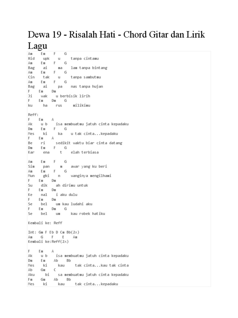Chord Gitar Dewa 19 Risalah Hati, Lirik Lagu Lengkap di 2020 | Lirik lagu, Lagu, Lirik