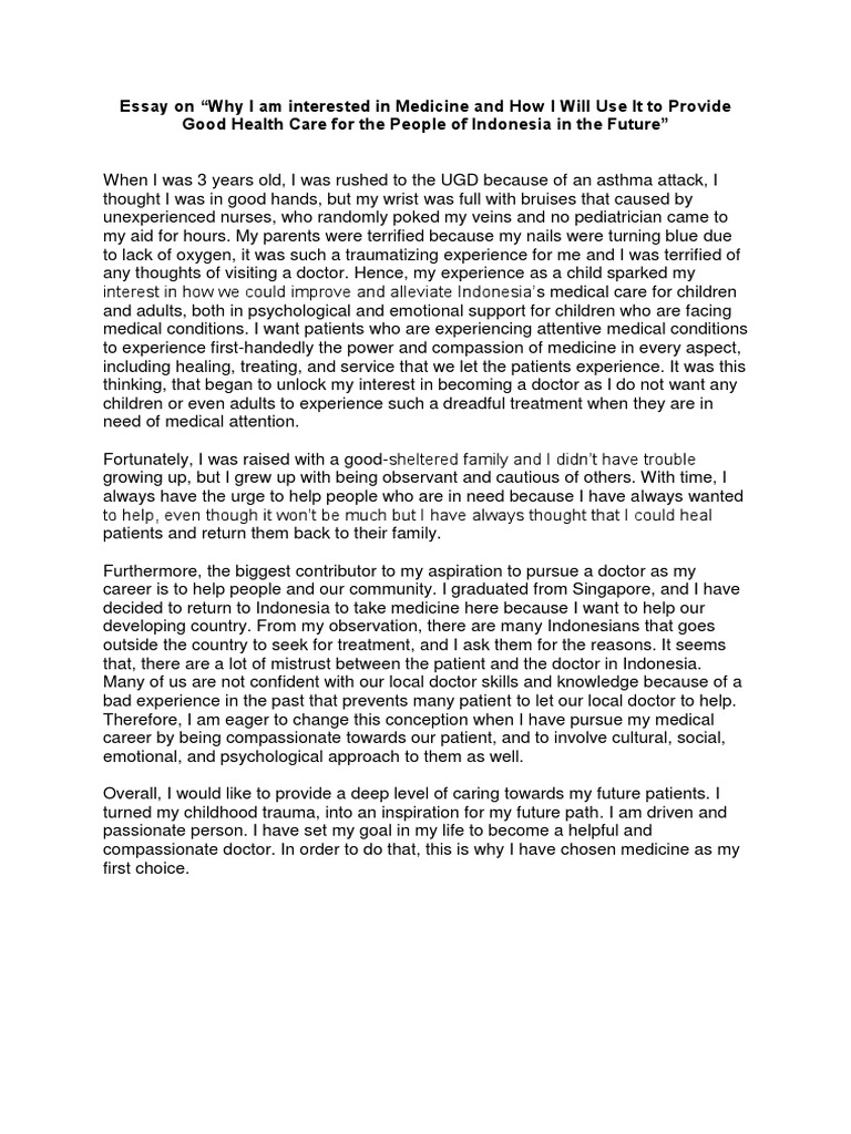 Essay on “Why I am interested in Medicine and How I Will Use It to Provide Good Health Care for the People of Indonesia in the Future” | Physician | Compassion