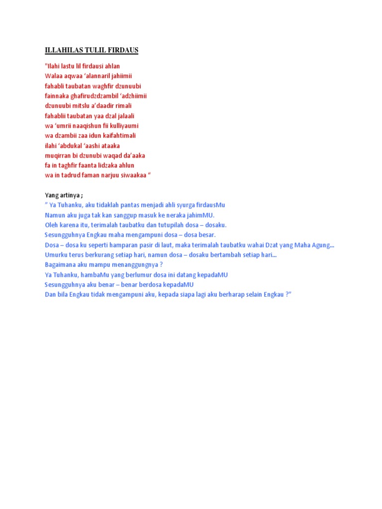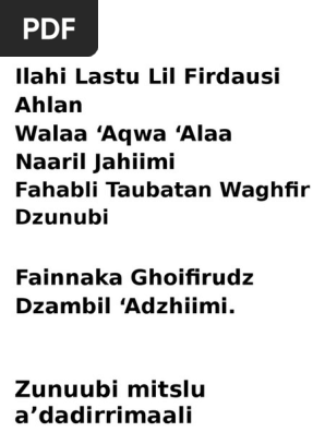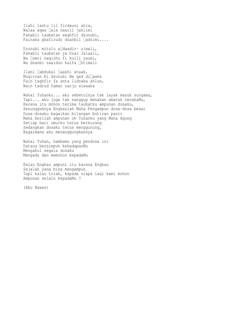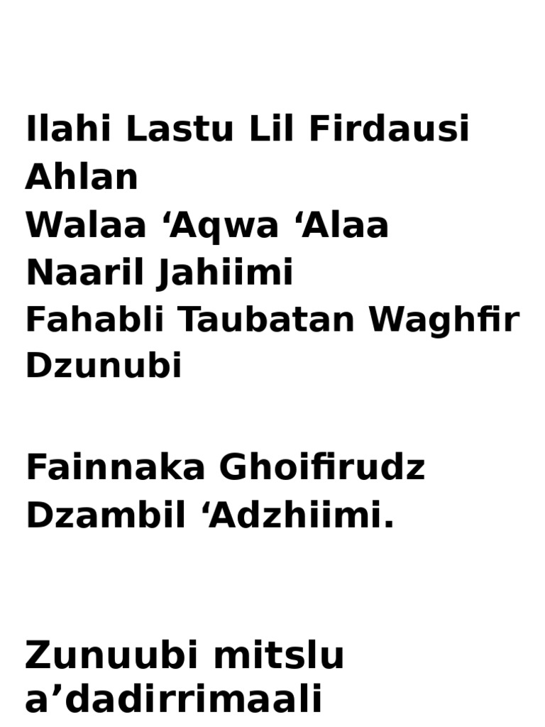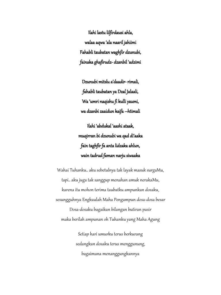 Ilahi lastu lil firdausi ahlaan Wa’ala Aqwa ‘alannaril jahiimi Fahabli taubatan waghfir dzunubi Fainnaka ghafirudz dzmbil ‘adziimi Dzunubi mitslu ‘adadirrimaali Fahabli taubatan ya dzal jalaali Wa ‘umrii naaqishun fii kulliyaumi Wa dzanbi