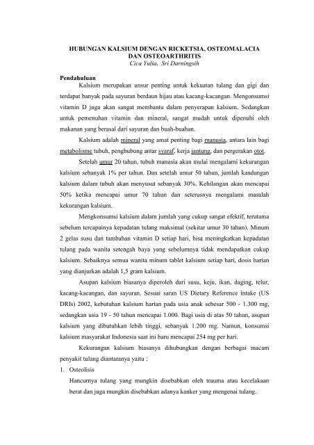 HUBUNGAN KALSIUM DENGAN RICKETSIA, OSTEOMALACIA DAN OSTEOARTHRITIS Cica Yulia, Sri Darningsih Pendahuluan Kalsium merupakan un