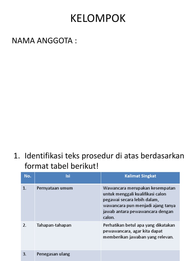 1.identifikasi teks prosedur kiat berwawancara kerja berdasarkan format tabel 2.dari dinya - Brainly.co.id