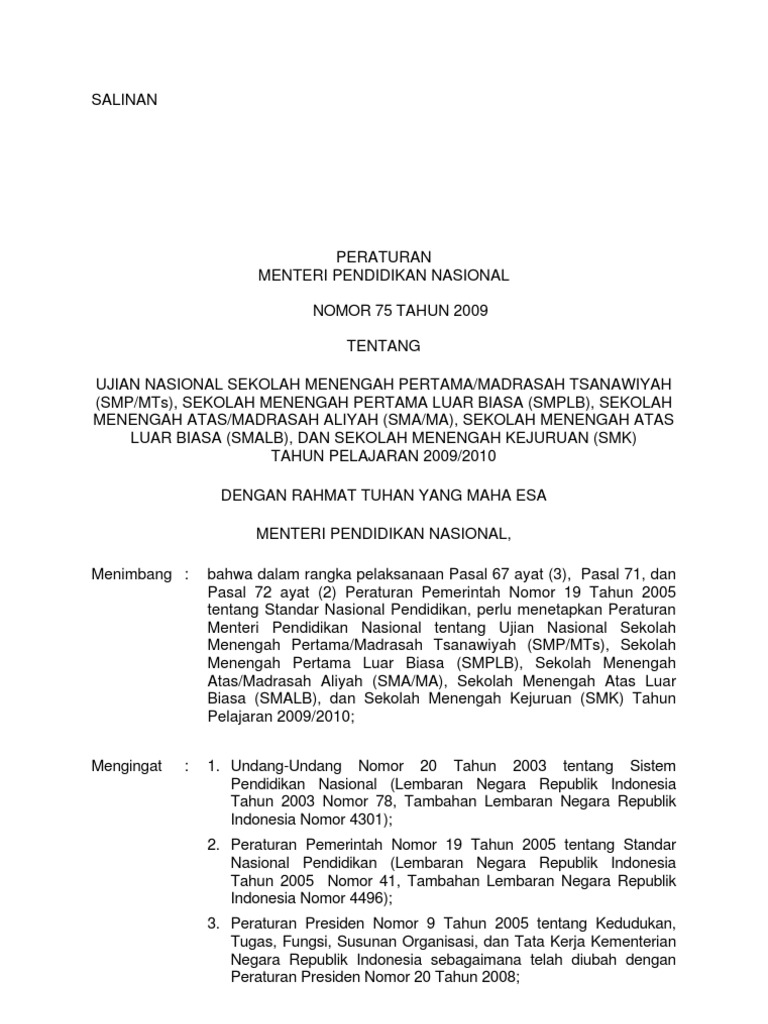 SKL Ujian Nasional SMP-SMA-SMK 2010 Permen 75 Tahun 2009