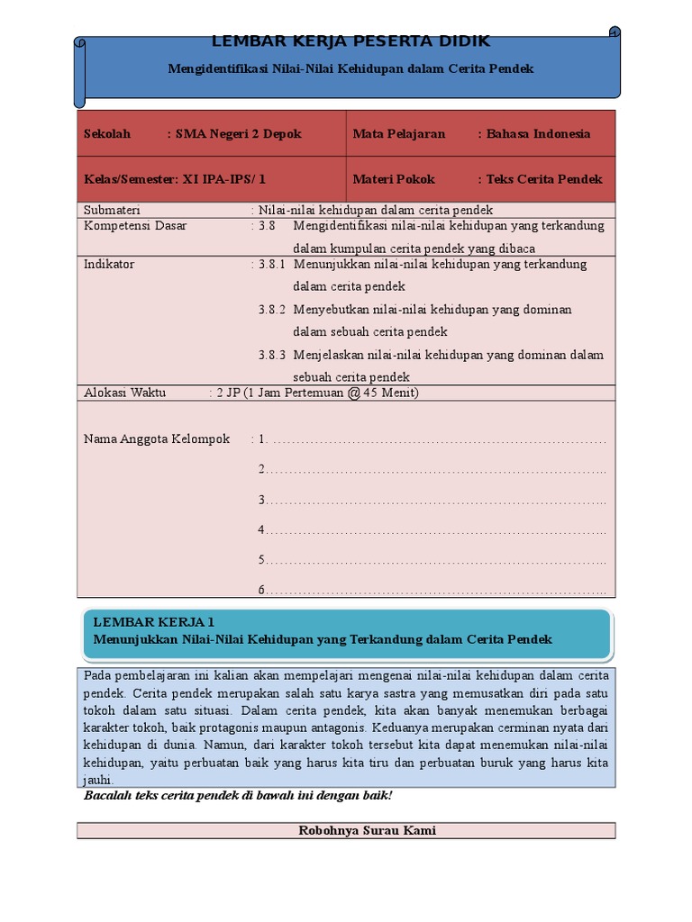 Lembar Kerja Peserta Didik: Lembar Kerja 1 Menunjukkan Nilai-Nilai Kehidupan yang Terkandung dalam Cerita Pendek