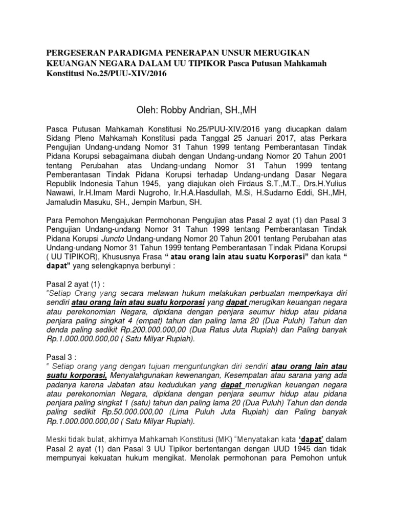 Pergeseran Paradigma Penerapan Unsur Merugikan Keuangan Negara Dalam Uu Tipikor Pasca Putusan Mahkamah Konstitusi No