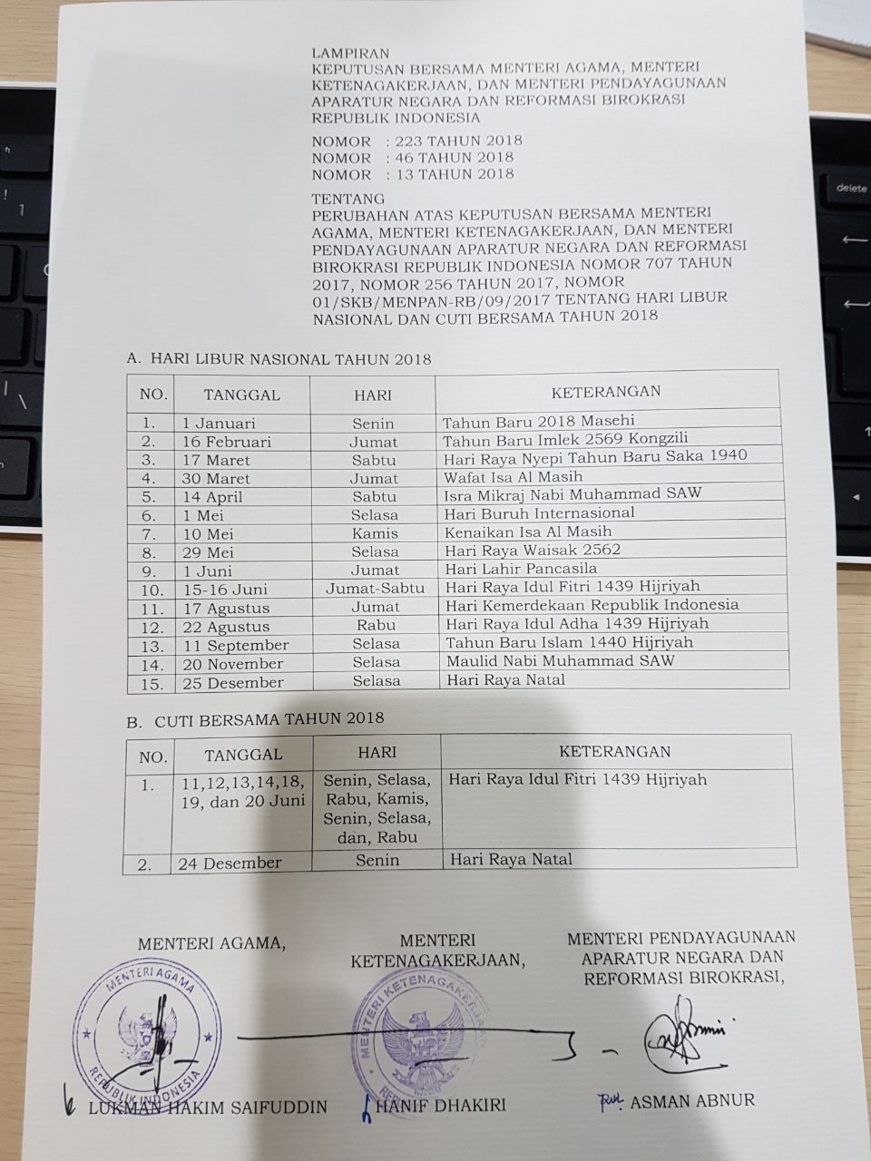 Hari Libur Nasional dan Cuti Bersama 2018 Tambah 3 Hari, SKB Perubahan Tiga Menteri Diterbitkan