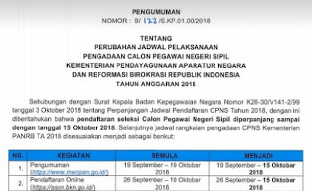 Kementerian Pendayagunaan Aparatur Negara dan Reformasi Birokrasi - Perubahan Jadwal Pelaksanaan Pengadaan CPNS Kementerian PANRB Tahun Anggaran 2018