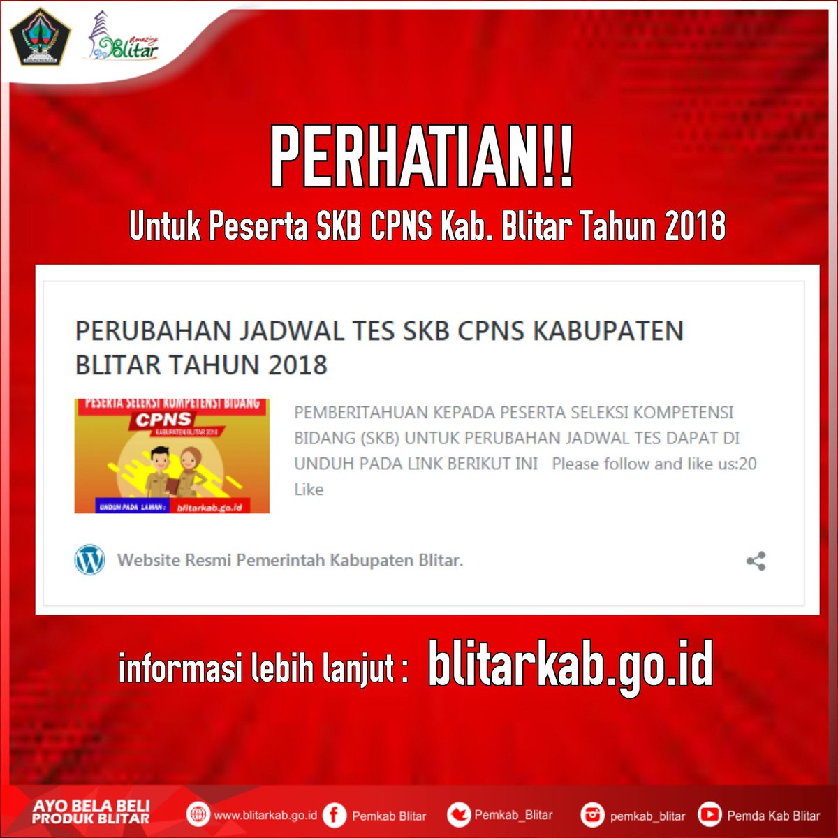 PEMKAB BLITAR on Twitter: “PEMBERITAHUAN KEPADA PESERTA SELEKSI KOMPETENSI BIDANG (SKB) CPNS KABUPATEN BLITAR, UNTUK PERUBAHAN JADWAL TES DAPAT DI UNDUH PADA WEBSITE https://t.co/TjiylVMyJg #CPNS2018 #AmazingBlitar #kabupatenBlitar #pemkabBlitar… https …