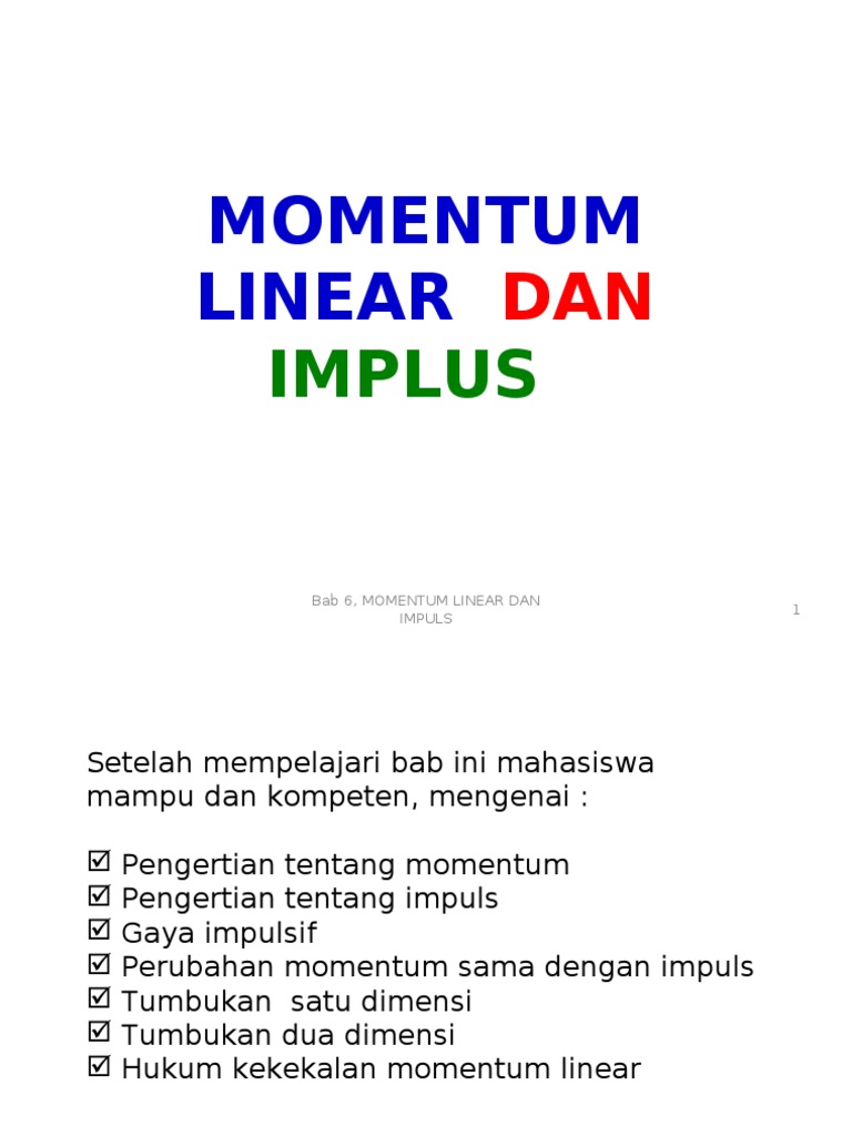MOMENTUM LINEAR DAN IMPULS (1) Pengertian tentang momentum, Pengertian tentang impuls, Gaya impulsif, Perubahan momentum sama dengan impuls | DuniaKuMu