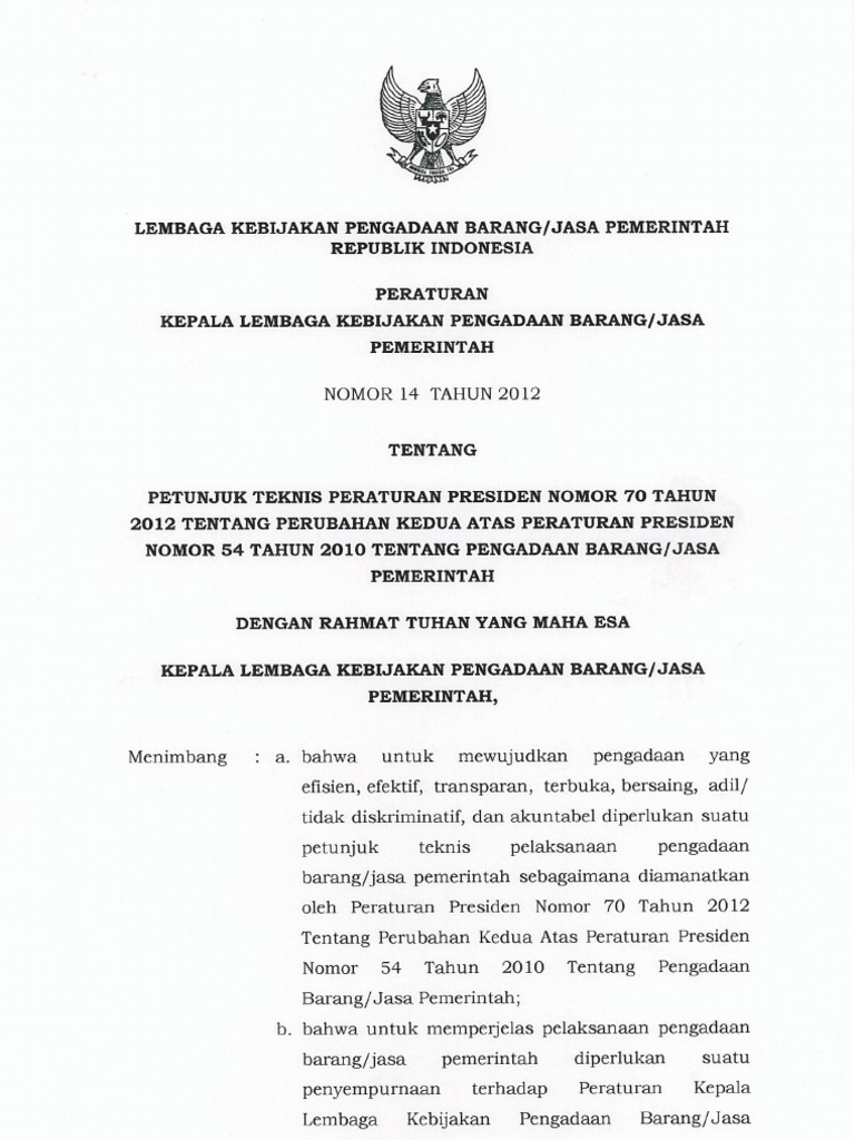 Perka LKPP 14-2012 Petunjuk Teknis Perpres No. 70 Tahun 2012 Tentang Perubahan Kedua Atas Perpres No. 54 Tahun 2010 Tentang Pengadaan Barang/Jasa Pemerintah